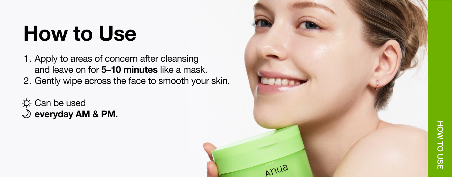 Appliquez un tampon sur le visage, en évitant le contour des yeux. Tapotez doucement en mouvements circulaires pour une application uniforme. Laisser sécher pendant 2 à 3 minutes avant de procéder aux soins de la peau ou au maquillage. Pour de meilleurs résultats, utilisez quotidiennement ou tous les deux jours. Évitez tout contact avec la racine des cheveux et d’autres zones sensibles.
