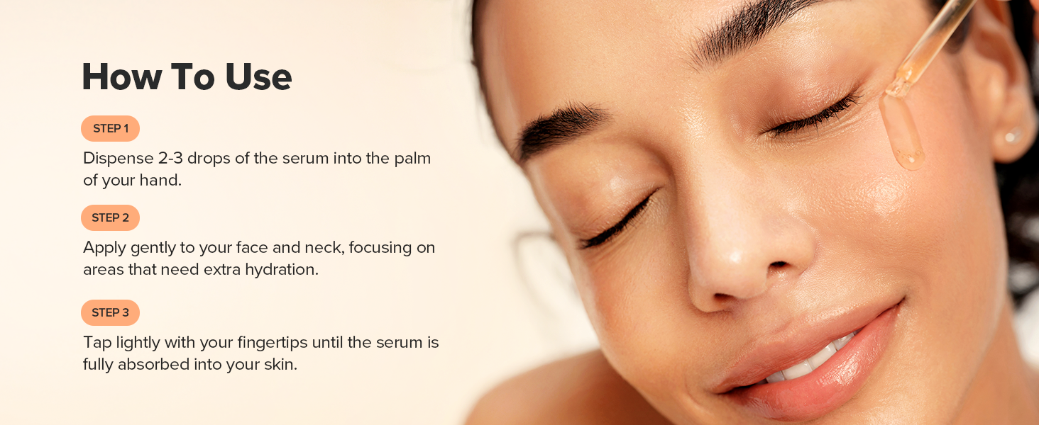 Appliquez 2 à 3 gouttes de sérum sur le visage et tapotez doucement pour faciliter l’absorption.