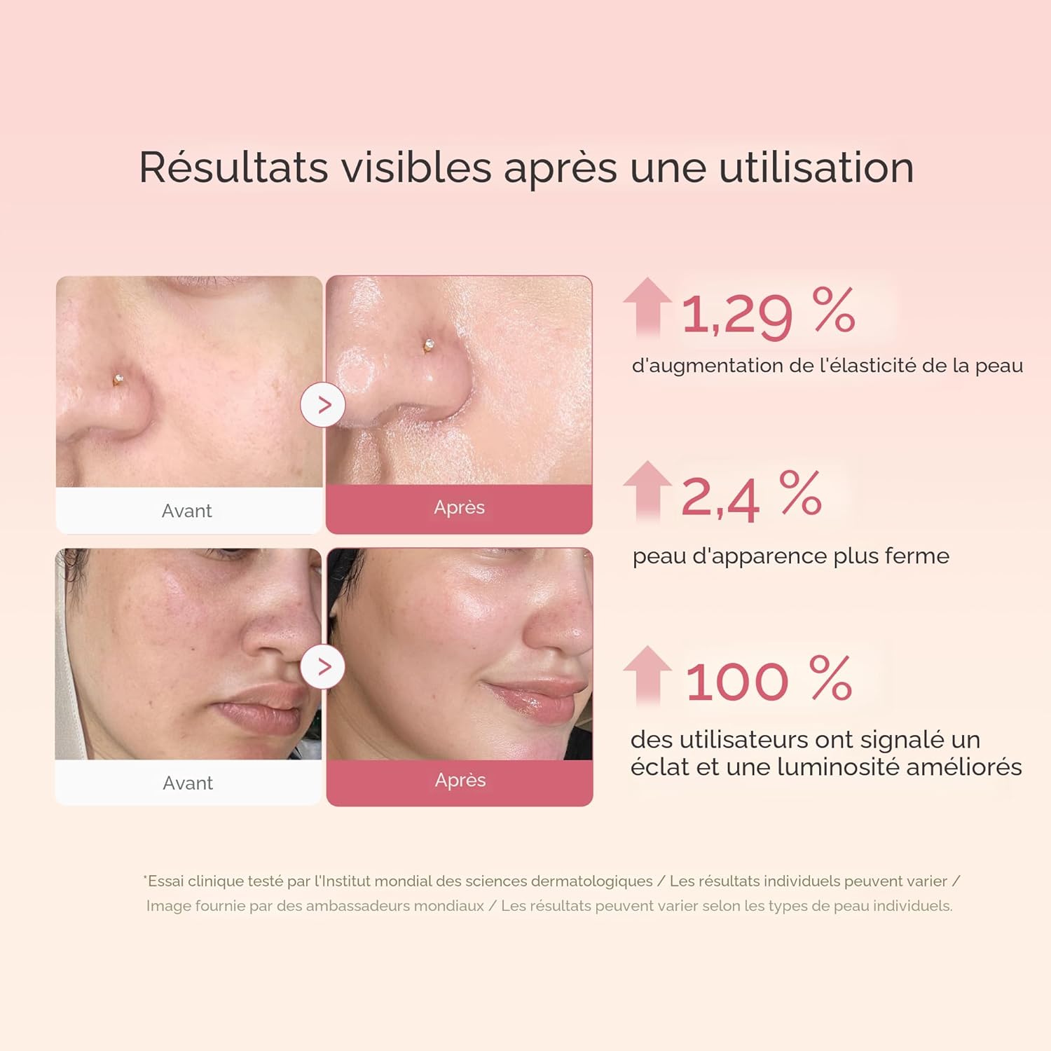 - Testé dermatologiquement : élasticité de la peau améliorée de 1,793 % et affaissement de la peau 2,488 % amélioré après 24 heures.